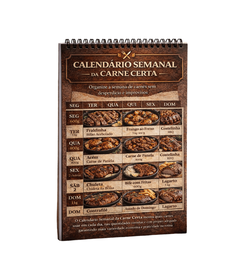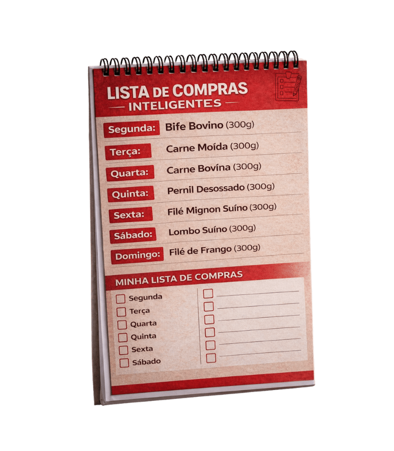 É o guia prático que te orienta antes de ir ao açougue, mostrando exatamente o que comprar, quanto comprar e para qual momento da semana.